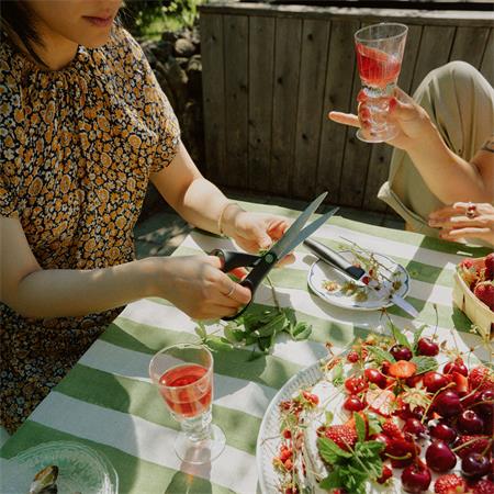 A Fiskars Functional Form ReNew 21 cm-es konyhai olló egy megbízható, sokoldalú eszköz a mindennapi konyhai feladatokhoz. Kifejezetten élelmiszerek és csomagolóanyagok vágására tervezték: könnyedén elbánik zöldfűszerekkel, húsokkal, zöldségekkel, konyhai fóliával vagy zacskókkal is.
