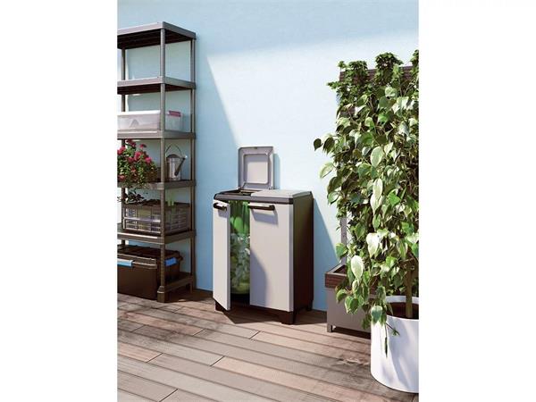 A KETER Split Premium szelektív hulladékgyűjtő szekrény intelligens kialakításának és modern, sötétszürke/fekete megjelenésének köszönhetően stílusosan és egyszerűen tesz a környezet védelméért.